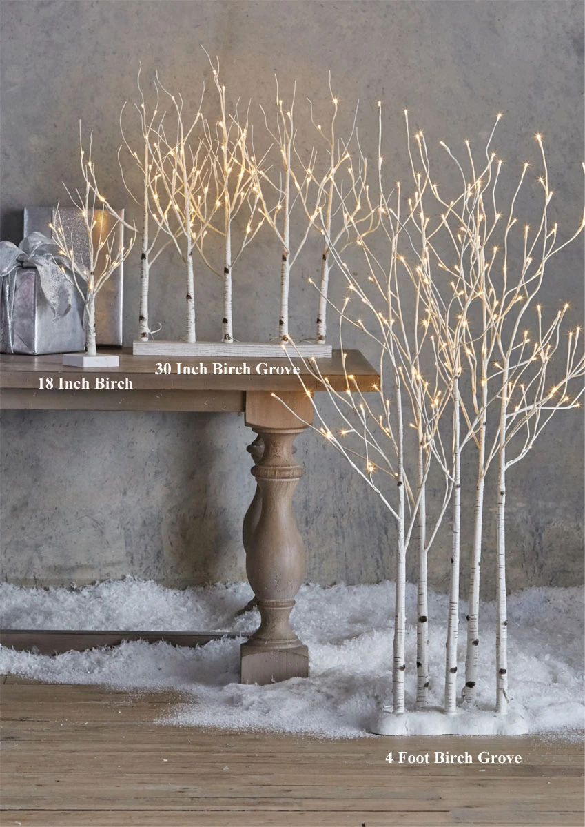 Lighted 4 foot birch grove on white rounded edge base. 5 white branches with 175 warm white LED lights. Indoor and Outdoor Use, Steady On, Includes 1 DC Adapter, Lights Approx 50,000 Hours, Approx 10′ of Wire to Adapter, Adapter UL Certified.
