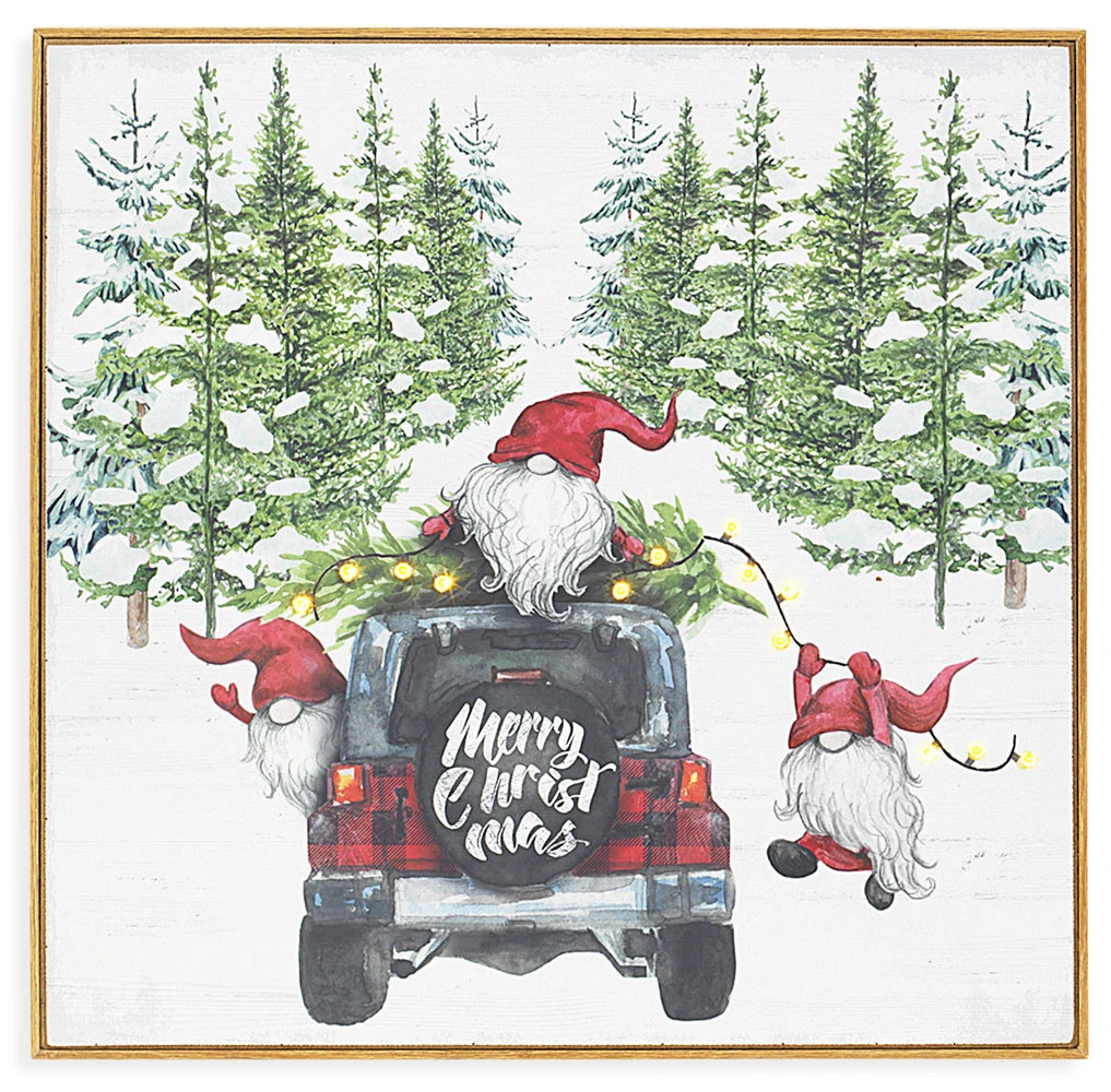 Battery operated lighted wood sign Three Gnomes riding in, on top and hanging out of jeep with garland and lights. A must have! The perfect accent to your Holiday decor, also making this a new and exciting gift.
