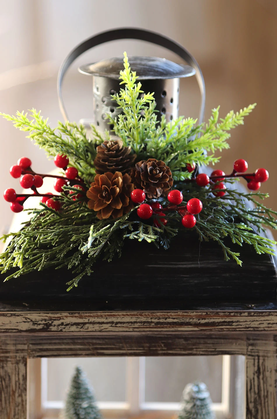 The lantern with it’s look of antique wood with window panes and metal top embellished with Holiday Christmas Greenery and Berries.