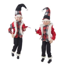 Set Of 2 Posable Christmas Elf Figures With Cardinals In Plaid 2 Assorted