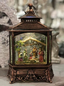 Nativity Scene Antique Bronze Lighted Water Lantern With Swirling Glitter – Plays Silent Night