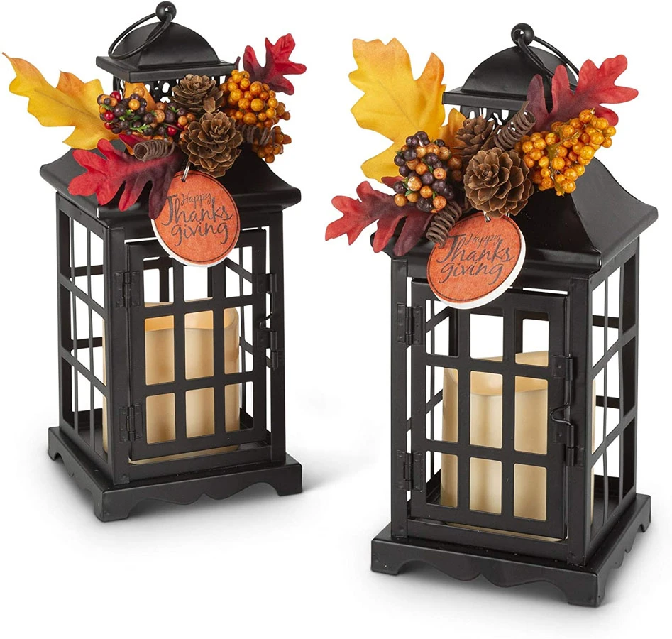 Set of 2 Metal Fall lanterns with LED candle. 6 Hour Timer. Fall Floral accents include pine cones, fall berries, colorful fall leaves and a Happy Thanksgiving hang tag. The panels of the lantern are open. No glass or plastic to break or obstruct the view of the LED candle. Comes in a decorative carrier.