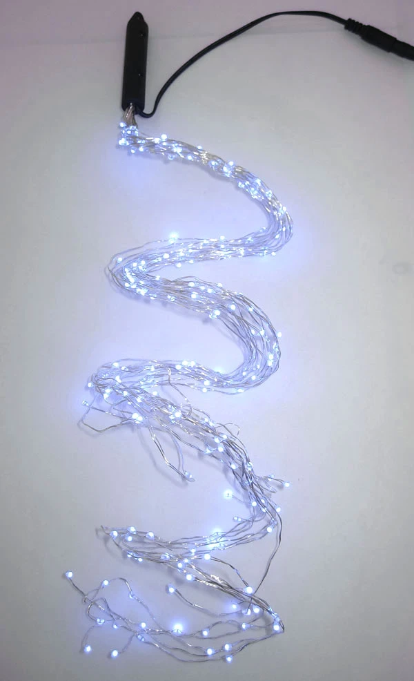 Bundle of individual light strands with 200 LED’s total. Each strand is 40 inches long. Lead to electric transformer is 5.5 feet. Silver wire.