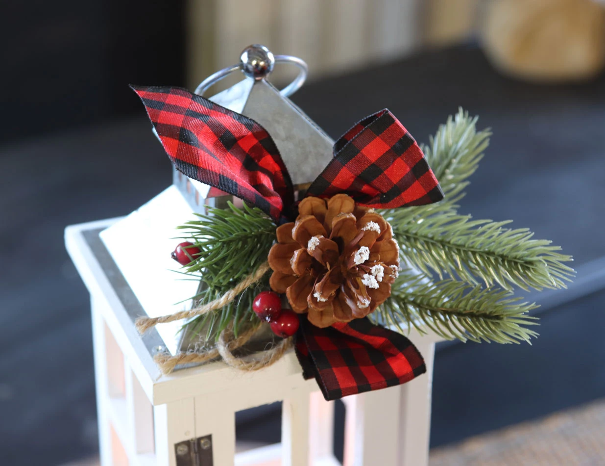 - Floral accent includes: Red and black buffalo check ribbon, pine cone, red berries and greenery